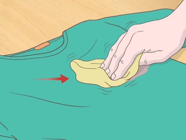 - При работе с загрязнением необходимо разместить вещь на ровной поверхности. Желательно подложить дощечку, обернутую тканью, под пятно.
