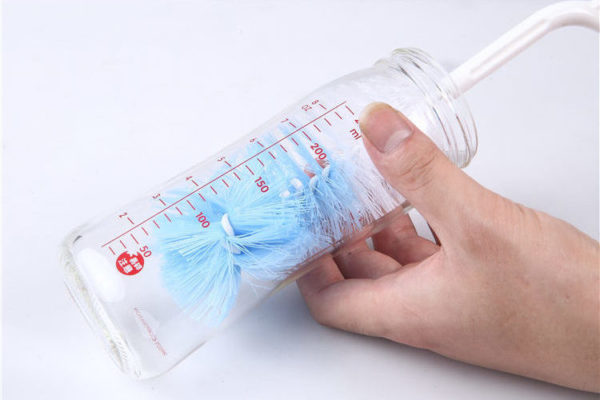 Мыть бутылочки нужно в горячей воде при помощи средств, предназначенных для мытья детской посуды, соды, детского или хозяйственного мыла; желательно использовать специальные ершики — это поможет удостовериться, что бутылочка полностью вычищена от остатков молока. Также особое внимание следует уделить резьбе на горлышке и выпуклым частям. Соска должна обрабатываться отдельно.